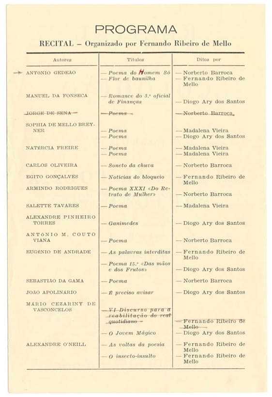 Na imagem, o programa de um recital de poesia que teve lugar em 1963, na Sociedade Nacional de Belas Artes (Lisboa).