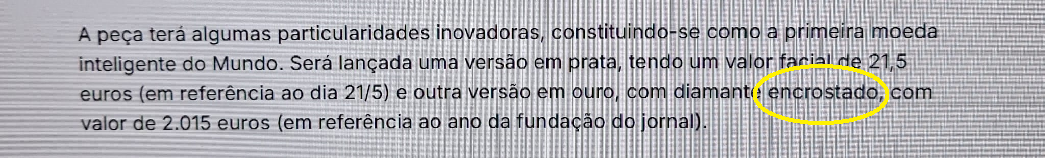 O terceiro caso desta breve lista é suscetível de ferir a carapaça (a crosta?) das sensibilidades mais robustas: «Será lançada um versão em prata [...] e  outra versão em ouro, com diamante "encrostado" [...]» ("Banco de Portugal lança moeda ‘inteligente’ alusiva ao 10.º Aniversário do jornal O Minho", O Minho, 01/04/2025). Esperando que o equívoco não seja alguma brincadeira do 1.º de abril, refira-se que a forma correta é incrustado, do verbo incrustar, «fixar ou fixar-se fortemente numa superfície, de modo a ficar embutido» (dicionário da Academia das Ciências de Lisboa). Não se pense, porém, que encrostar é clara deturpação de incrustar, pois é verbo dicionarizado, com o significado de «criar crosta» (cf. ibidem), o que não será exatamente o que se tenciona noticiar, muito embora incrustar e encrostar partilhem o mesmo radical latino, «crusta, ae "crosta, revestimento rugoso e endurecido, côdea, tudo o que serve para envolver, cobrir; lâmina, folha, capa, camada, superfície"» (Dicionário Houaiss).